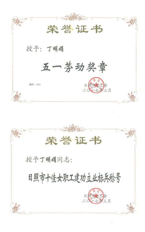 2017年3月,我公司財(cái)務(wù)總監(jiān)丁明娟被日照市總工會(huì)授予“五一勞動(dòng)獎(jiǎng)?wù)隆?、“日照市十佳女職工建功立業(yè)標(biāo)兵”稱號(hào)
